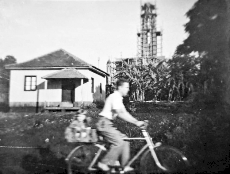 Benno Tesche com a filha Lilian na garupa de sua bicicleta na década de 1950. Ao fundo é possível ver a igreja da Comunidade São Paulo ainda em construção.