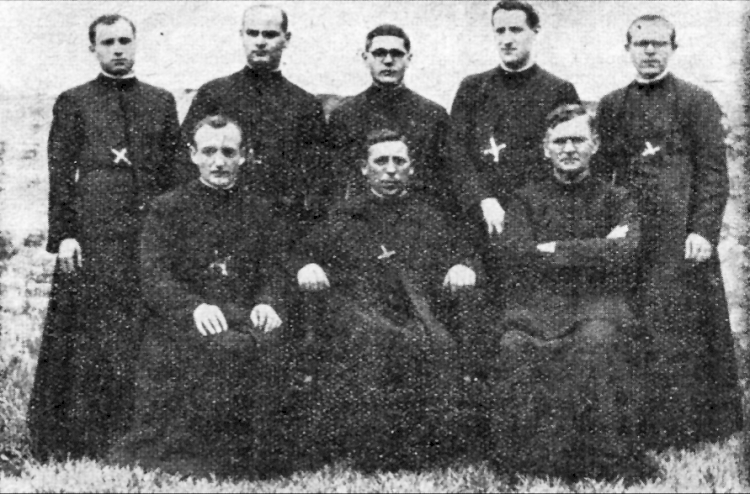 Grupo de padres italianos do Instituto Missões Consolata que desenvolveu trabalhos no Brasil. Destes, apenas os padres Dionisio Peluso, Afonso Durigon e Antônio Ronchi assumiram funções em Três de Maio - da esquerda para a direita em pé, o segundo, quarto e quinto religiosos respectivamente