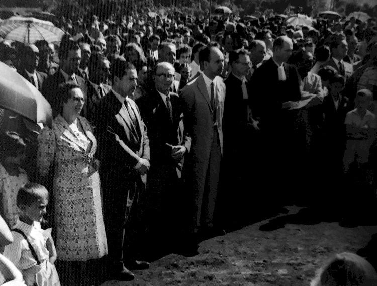 Inauguração da Escola Normal Rural Getúlio Vargas. Da esquerda para a direita: Paula Henn (esposa de Germano Dockhorn), o Governador Leonel Brizola, Germano Dockhorn, Secretário de Educação Mariano B. da Rocha e o pastor Dohms