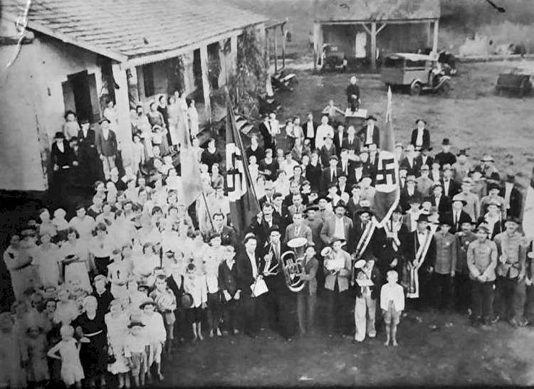 Moradores de Flor de Maio reunidos com as bandeiras nacionais da Alemanha nos anos que precederam a Segunda Guerra Mundial