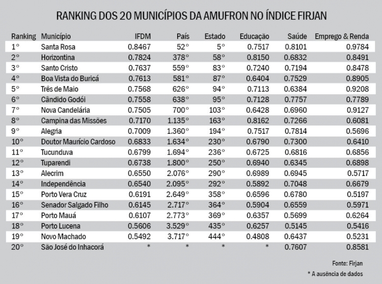 Na outra ponta do ranking regional, os três municípios com pior colocação no IFDM da Amufron são Novo Machado (0.5492), Porto Lucena (0.5606) e Porto Mauá (0.6107). As notas mais baixas foram puxadas, principalmente, pelo baixo desempenho em Educação e Emprego & Renda.