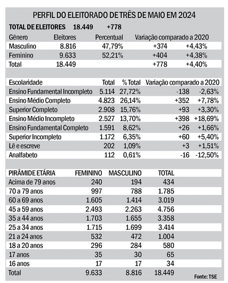 O Tribunal Superior Eleitoral divulgou na última sexta-feira, dia 19, o total de eleitores aptos a votar nas eleições de 6 de outubro. Em Três de Maio, serão 18.449 eleitores, representando um aumento de 4,31% em relação ao eleitorado das eleições de 2020, o que equivale a 778 eleitores a mais.