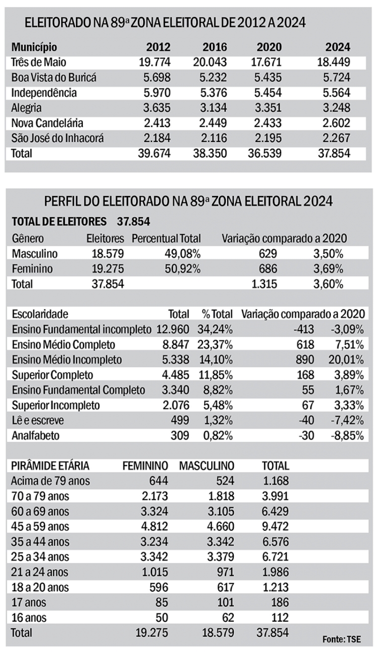 Somando os eleitores dos cinco municípios que compõem a 89ª Zona Eleitoral, houve um acréscimo de 3,60% em comparação às eleições municipais de 2020. Agora são 37.854 eleitores (+1.315), dos quais 19.275 são mulheres (50,92%) e 18.579 são homens (49,08%).