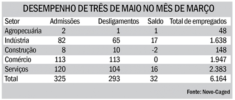 O terceiro mês do ano foi de saldo positivo de empregos em Três de Maio, conforme dados do Novo-Caged. Com 352 novas admissões, contra 293 desligamentos, o mês de março apresenta um saldo positivo de 32 postos de trabalho com carteira assinada. Foi o terceiro mês consecutivo em que o município teve desempenho positivo na geração de empregos.