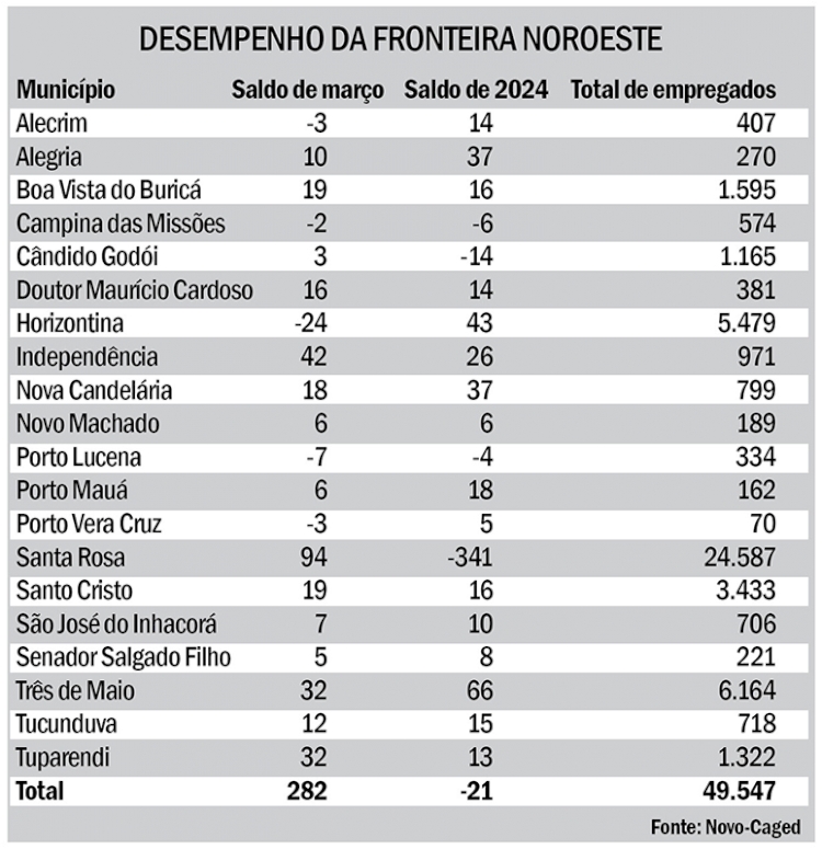Na região, Três de Maio apresenta o melhor desempenho considerando os primeiros três meses de 2024. No acumulado do ano, entre os 20 municípios da Fronteira Noroeste, são 66 empregos criados, o que representa um crescimento de 1,08% comparado a dezembro de 2023. No acumulado do ano, todos os setores estão apresentando saldo positivo.