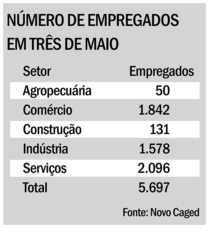 Conforme o Cadastro Geral de Empregados e Desempregados (Novo Caged), Três de Maio fechou o primeiro semestre do ano com saldo positivo de 53 empregos. Ainda, segundo a plataforma do Ministério do Trabalho, há 5.697 trabalhadores com carteira assinada no município. 36,79% são do setor de serviços, 32,33% do comércio, a indústria emprega 27,7%, construção 2,3% e a agropecuária, 0,88%.